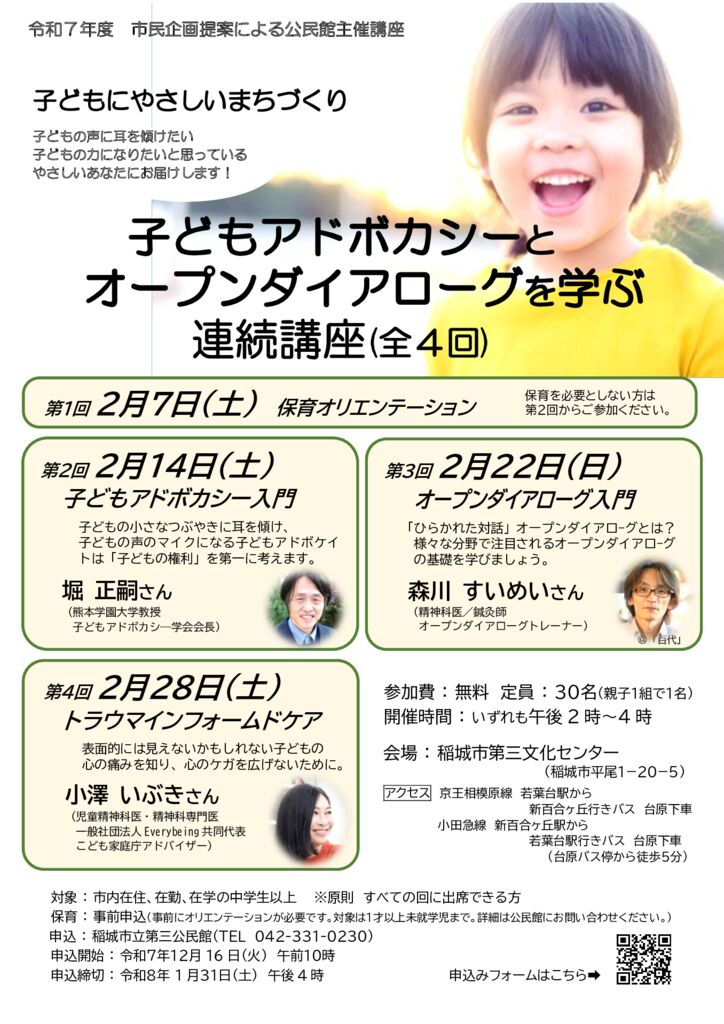 2026年1月12日 / 最終更新日 : 2026年1月12日 inagi 「子どもアドボカシーとオープンダイアローグを学ぶ連続講座」のお知らせです 2026年2月に稲城市の第3文化センターで開催されます講座のご案内です。(※市民企画提案が実現しました。稲城ネットは子どもに関わる活動を応援しています。去年より「子どもの声からはじめようプロジェクト!」も展開中。) 14日(土)子どもアドボカシー入門 22日(日)オープンダイアローグ入門 28日(土)トラウマインフォームドケア FacebookXBlueskyHatenaCopy